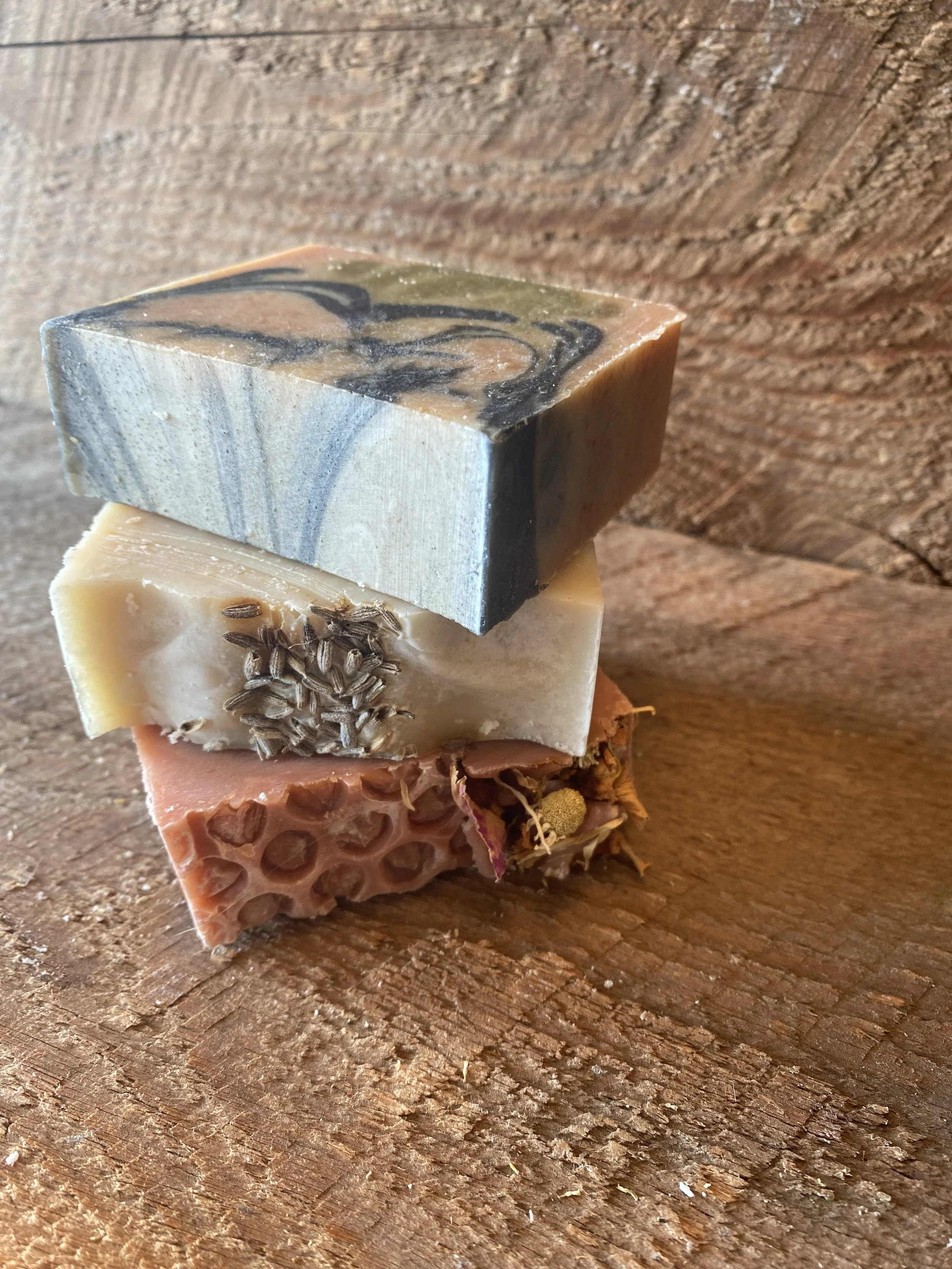 Soaps – Small-batch bars made with a blend of tallow or lard and buttermilk or goat milk, and oils like olive, coconut, and castor. Each bar is thoughtfully made and farm-inspired.